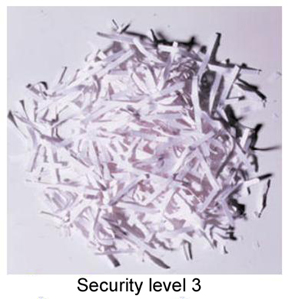 The third level: it is used for confidential documents utilization. Depending on the model, sheet of paper is cut into small rectangular 4x80 mm fragments, or parallel-cut can be used (2 mm strips).